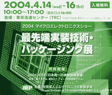 This exhibition is held for the top engineers who are in charge of the design and the development of substrates, materials, components and equipments which support the newest electronics packaging, such as information devices, digitized home appliances and PDA equipments, in the sophisticated information and networking world.